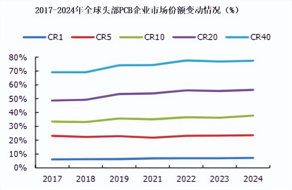 全球印制电路板(PCB)行业呈现“低集中度、高竞争性”的市场特征。数据显示,目前全球有超过2200家印制电路板(PCB)生产企业,主要分布在中国大陆、中国台湾、日本、韩国和欧美等国家或地区。从市场集中度看,行业龙头CR1(臻鼎科技)市占率长期稳定在6%-7%区间,CR5保持在23%左右。预计未来3-5年内,全球印制电路板(PCB)市场仍将维持相对分散的竞争格局。